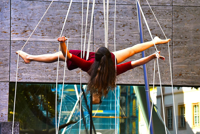 “Un mundo hecho de cuerdas en el que se anudan y desanudan metáforas de la feminidad, un cuerpo suspendido que danza resolviendo los enigmas del enredo al ritmo de un viaje sonoro.”